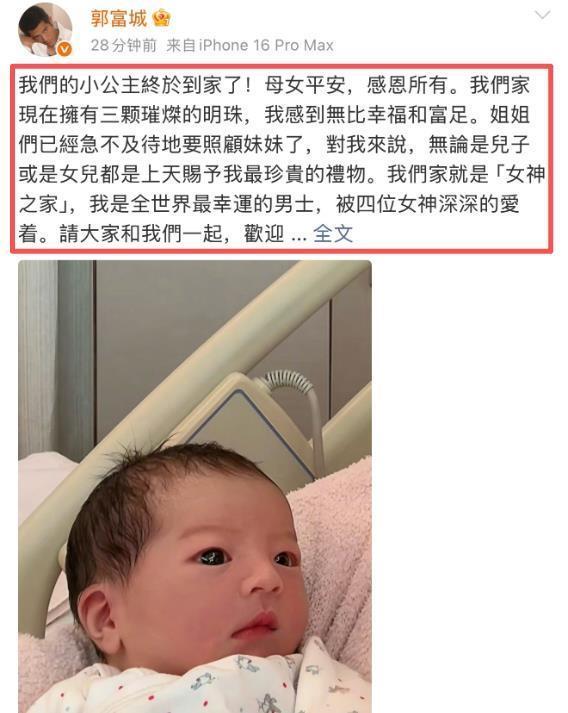 和他一同出现在医院的还有丈母娘,两个护士把婴儿车抬上车,然后一家人开车离开。 随后网上就议论纷纷方媛三胎生了,关于郭富城三胎得子的消息满天飞。 当天晚上,郭富城发文,宣布自己家又迎来了一位小公主。 他称家中拥有“三颗璀璨的明珠”,自喻“被四位女神深爱的幸运男士”。 郭富城还特意解释无论是女儿还是儿子,对他来说都是一样的宝贝。
