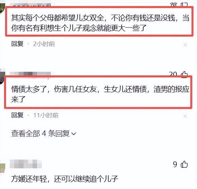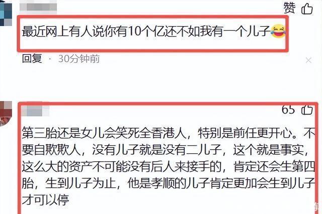 02 正当郭富城一家还沉浸在喜悦中,网上恶心一幕就出现了。 很多人嘲讽郭富城钱再多也没用,会被香港人嘲笑,因为没有儿子来继承他的遗产。 还有人将郭富城再次得女,与他过往的感情经历强行关联,抛出所谓的“报应论”,声称这是他当年对待前女友的“报应。 很多人挖苦方媛要一直生,直到生出儿子。