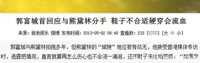 后来郭富城在一档节目回应这段感情,称:“鞋子不舒服不如换了它,硬穿只会流血。” 这番话将七年情分贬得一文不值,熊黛林年付出竟然换来一句“旧鞋”。 大家都替熊黛林感到委屈,认为郭富城始乱终弃。